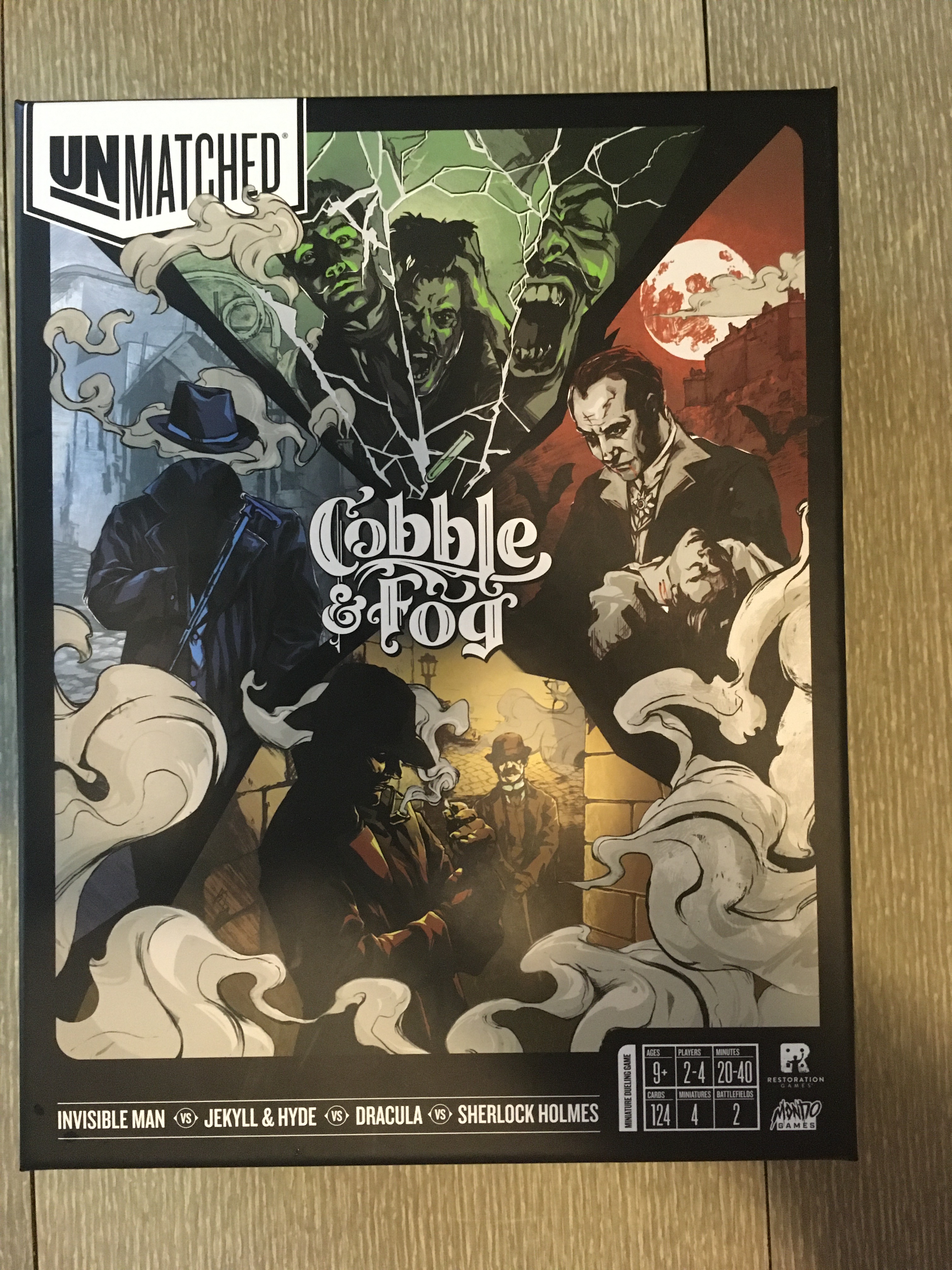 Color commentary: The fact that the different sets are completely interchangeable makes the game delightfully variable, because you can always choose different opponents or a different battlefield. I could also be touchy about this, but I really like that a 2-player game is the default assumption, and that special provisions have to be specified for 3- or 4-player games. Take that, people with gaming groups! I sauntered to an easy victory in the first game between Sherlock Holmes and Bigfoot, but that seems to have been because I inadequately explained to M what cards could be used in defense. Oops. The next two games were closer, but M pulled out the victory in the second game against Sherlock and in the game against Dracula. I really like the Cobble & Fog characters (Sherlock Holmes, Invisible Man, Dracula, and Dr. Jekyll/Mr. Hyde), probably most, but Jurassic Park and a couple of the original characters also seem intriguing. I know M was especially delighted by the Robin Hood vs. Bigfoot set, as those are two of his favorite legendary entities. I’m intrigued by the Bruce Lee set, which feels a little akin to the Kool-Aid Man character in the Funkoverse Strategy Game sets. This game also plays quite quickly with 2 (if not completely in clock time, also in terms of sense of time passing), so makes for a nice chance to play multiple rounds in a reasonable amount of time. If I hadn’t insisted we go for a walk to check on the fall foliage situation around here, we probably would have played several more rounds for a total play time of a couple hours. I do seem to be losing my 24-hour advantage over M, though, so either I’m getting better at explaining game instructions or I haven’t been suggesting the right games to maintain my edge.